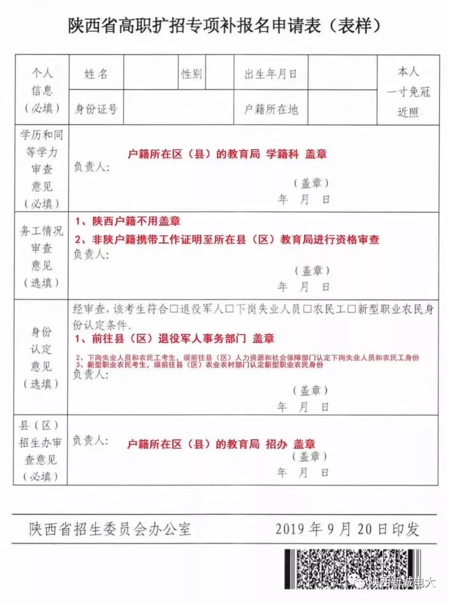 拟参加本次高职扩招专项补报名的考生,可于网上报名前,持本人二代居民身份证,前往户籍所在地县(区)招生办领取《高职扩招专项补报名申请表》(以下简称“申请表”,申请表也可联系新城电大老师索要)。